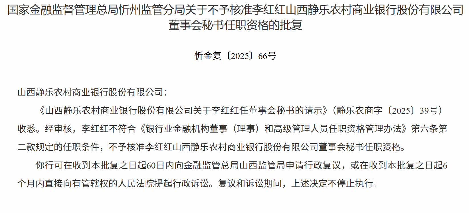 12月16日,国家金融监督管理总局忻州监管分局发布关于不予核准李红红山西静乐农村商业银行股份有限公司董事会秘书任职资格的批复,经审核,李红红不符合《银行业金融机构董事(理事)和高级管理人员任职资格管理办法》第六条第二款规定的任职条件,不予核准李红红山西静乐农村商业银行股份有限公司董事会秘书任职资格。