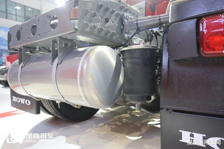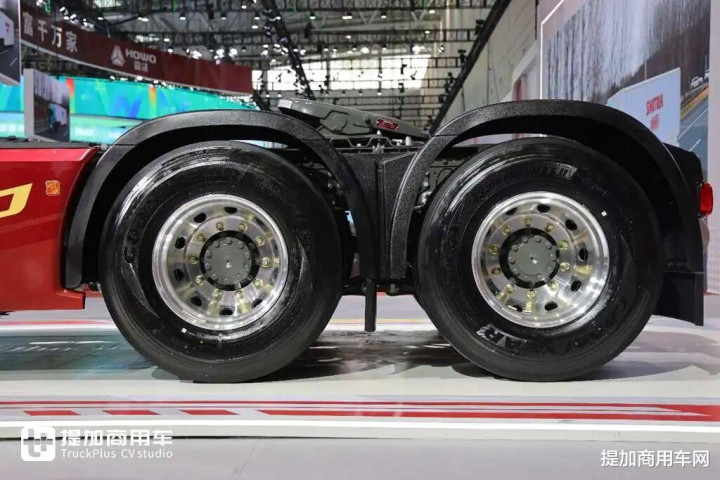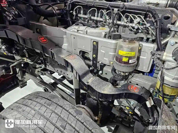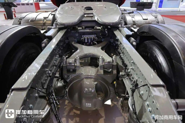重汽的新底盘采用气囊桥的后桥推力杆就是X型,如果是钢板桥,就是V推。像X推与气囊悬挂搭配,可以更好的稳固底盘,防止车桥位移,对行车稳定性有明显提升。
