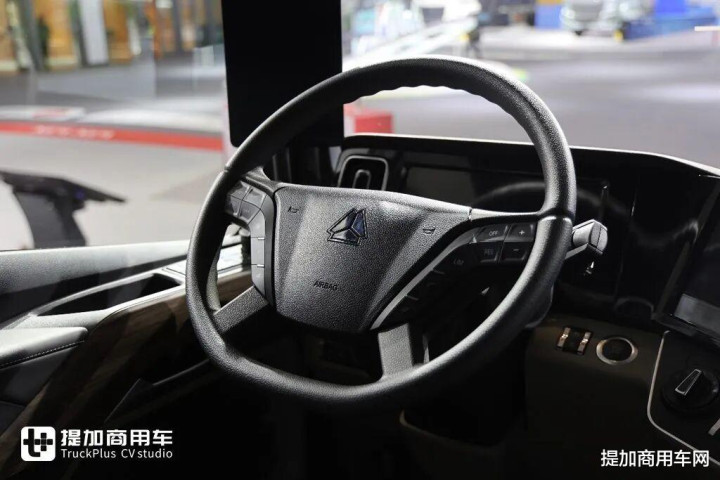 方向盘就是重汽现在家族化的一款四幅式调节的方向盘,汕德卡和黄河也在用,有定速巡航和多媒体控制功能。方向盘的调节角度比之前而言的话是做的更大了一些,采用的是气动锁止,能给驾驶员带来更为舒适的坐姿体验。