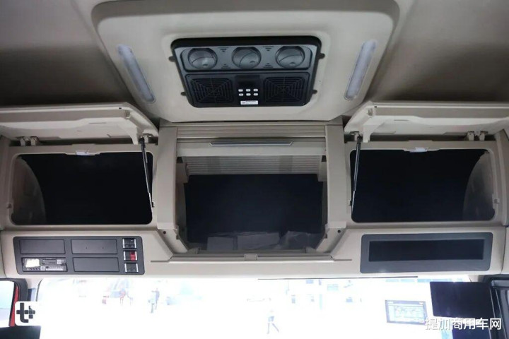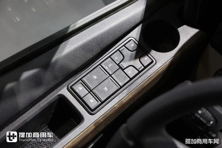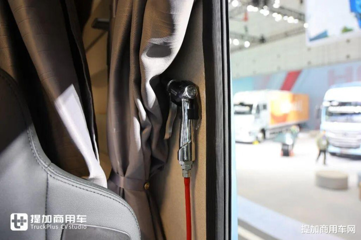 主副驾全部采用气囊减震座椅,可能是因为展车所以配置如此之高,如果是正常销售的话标准版本应该是主驾气囊副驾折叠座椅。主驾气囊座椅采用伊思灵NTS870气囊减震座椅,这也是高端重卡上的明星座椅产品,有阻尼调节、通风加热、腰部支撑、坐垫长度调节等等一系列功能。