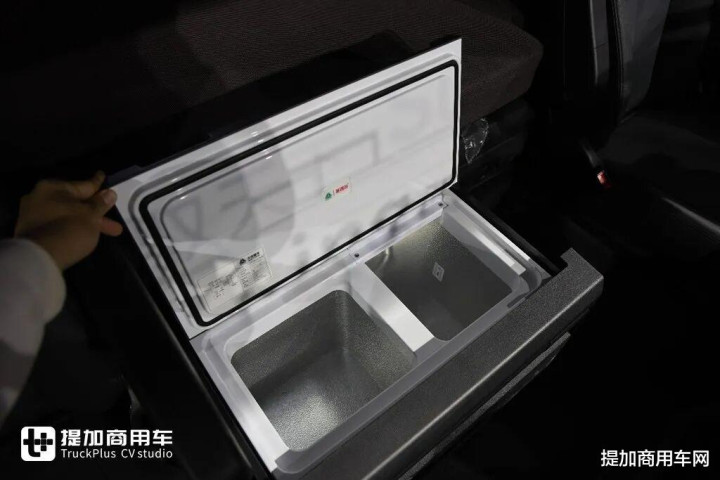 卧铺下方有车载冰箱和逆变器,车载冰箱为英德尔给重汽定制的,带分区,像日常的饭菜,或是饮品之类的都可以扔在冰箱的不同储存区域当中。