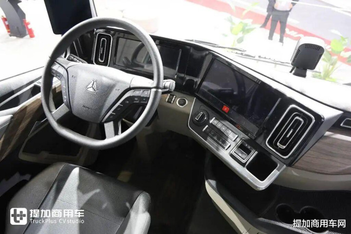 工作台的造型就是很标准的人机工程学工作台,右侧功能区向驾驶员一侧倾斜便于操作各类功能。仪表盘和车机全部采用液晶大屏,车机融合重汽全新AI“小重”,可以通过AI控制空调、车窗、查询故障码、导航等功能。